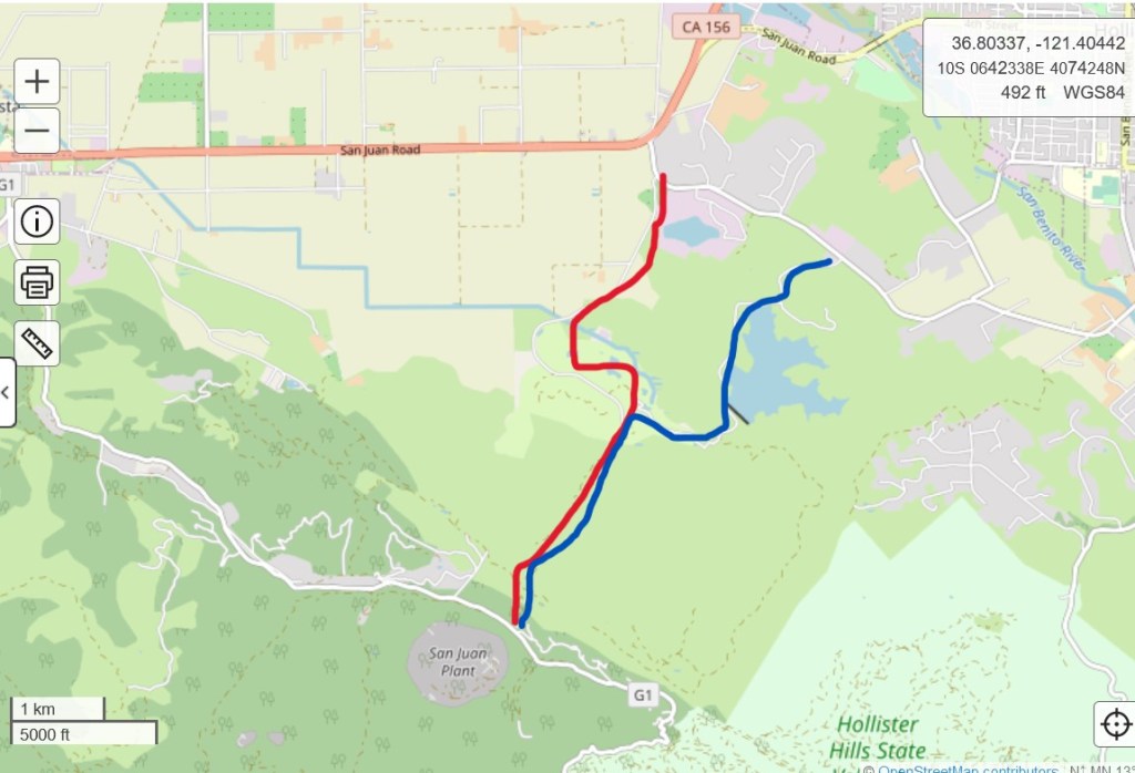 Evacuation Route Map: Enter gate just above 5000 San Juan Canyon Road. Path marked in red goes to San Juan Oaks. Path marked in blue cuts over through the Brigantino Ranch, towards San Justo Reservoir. Both routes go to Union Road.